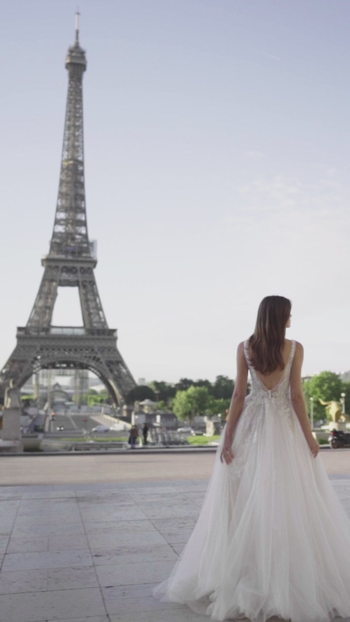 Step into romance with our stunning A-line dress, crafted from incredible glitter fabric and enhanced with a layer of transparent tulle over the skirt. The corset features a deep V-neckline, supported by inner cups, and adorned with floral appliques embellished with sequins and crystals, adding a touch of sparkle and elegance. The open back, finished with buttons, adds a special delicacy to the look. Embrace the enchantment of this gown and create unforgettable memories on your special day.