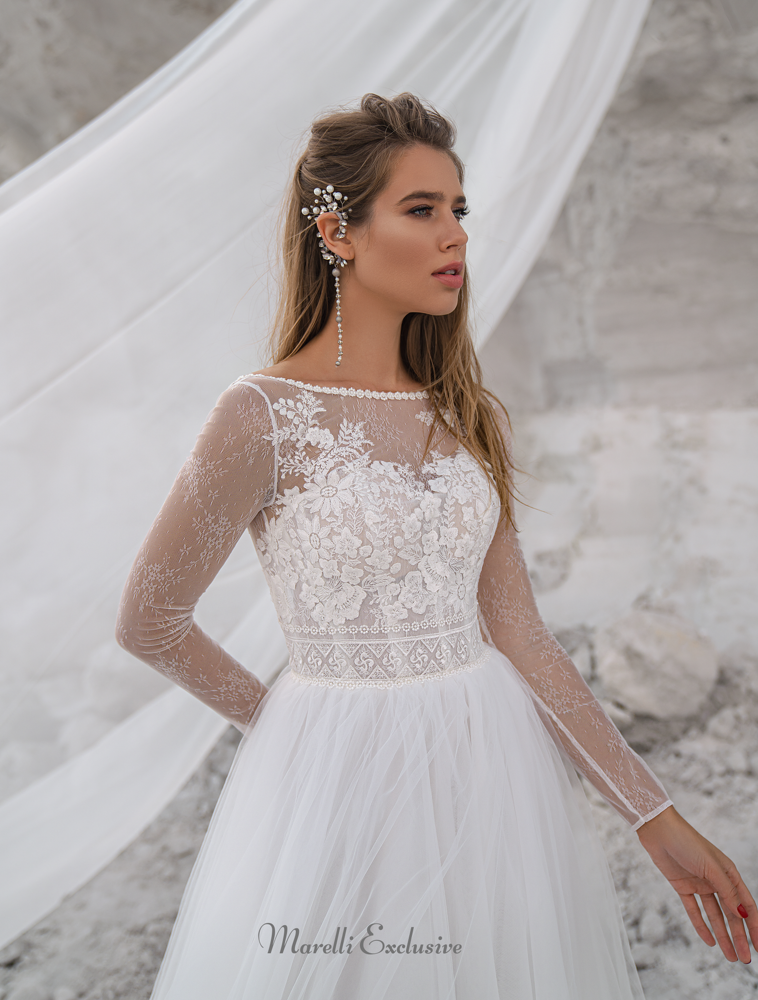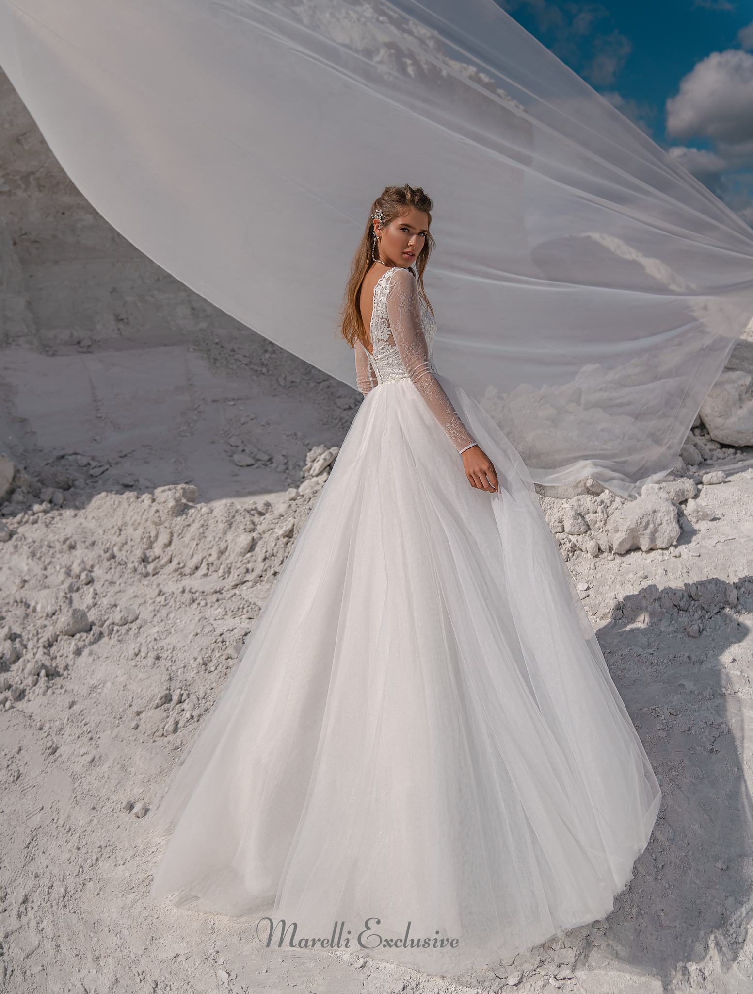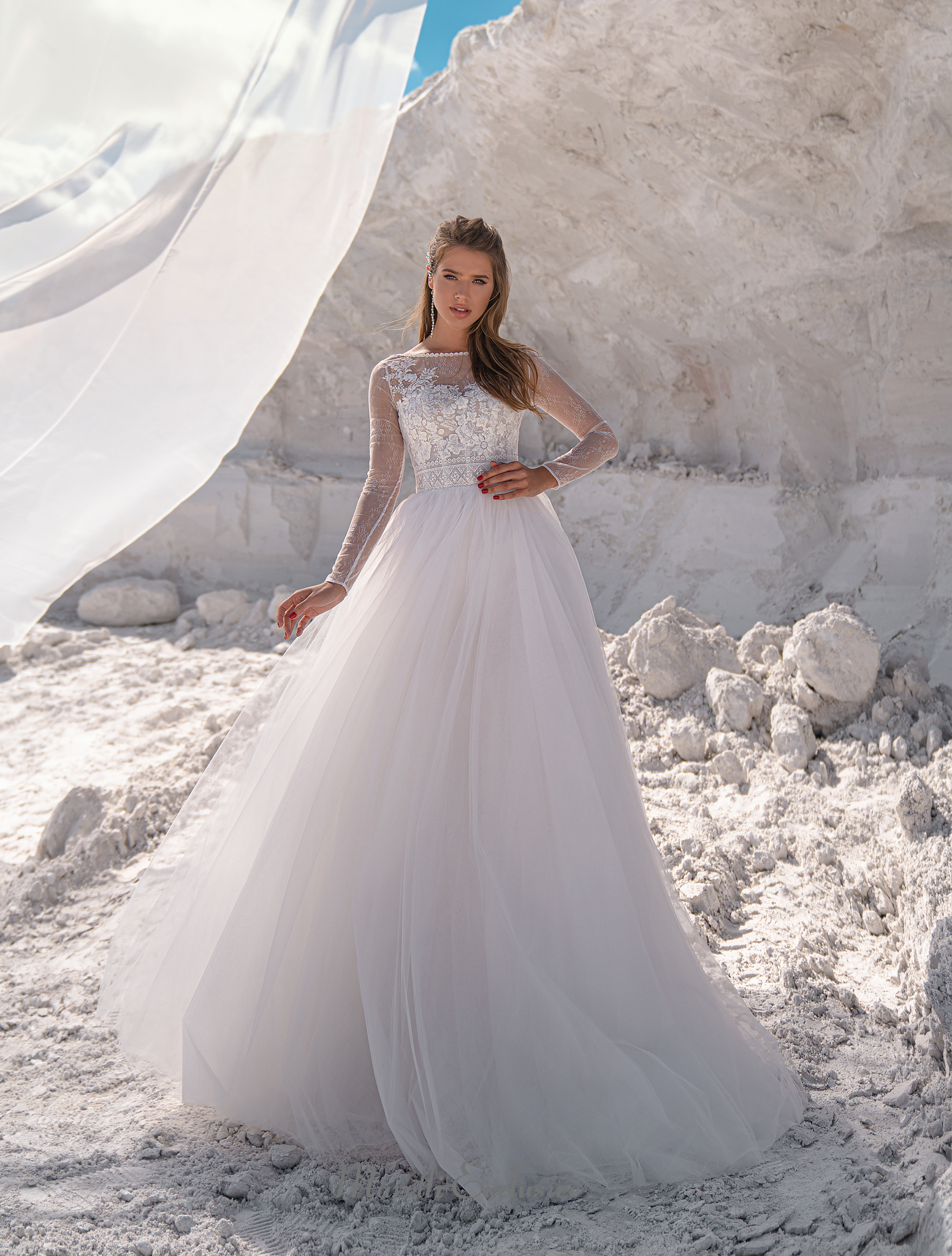 Astonishing A-line fit Wedding Dress. Featuring long sleeves, a sexy illusion neckline, beautiful flowing skirt, and long train. The back is gracefully adorned and open. The corset and skirt are exquisitely beaded and sequined with beautiful flowing floral patterns. Appliqués are delicately sewn throughout the gown. .