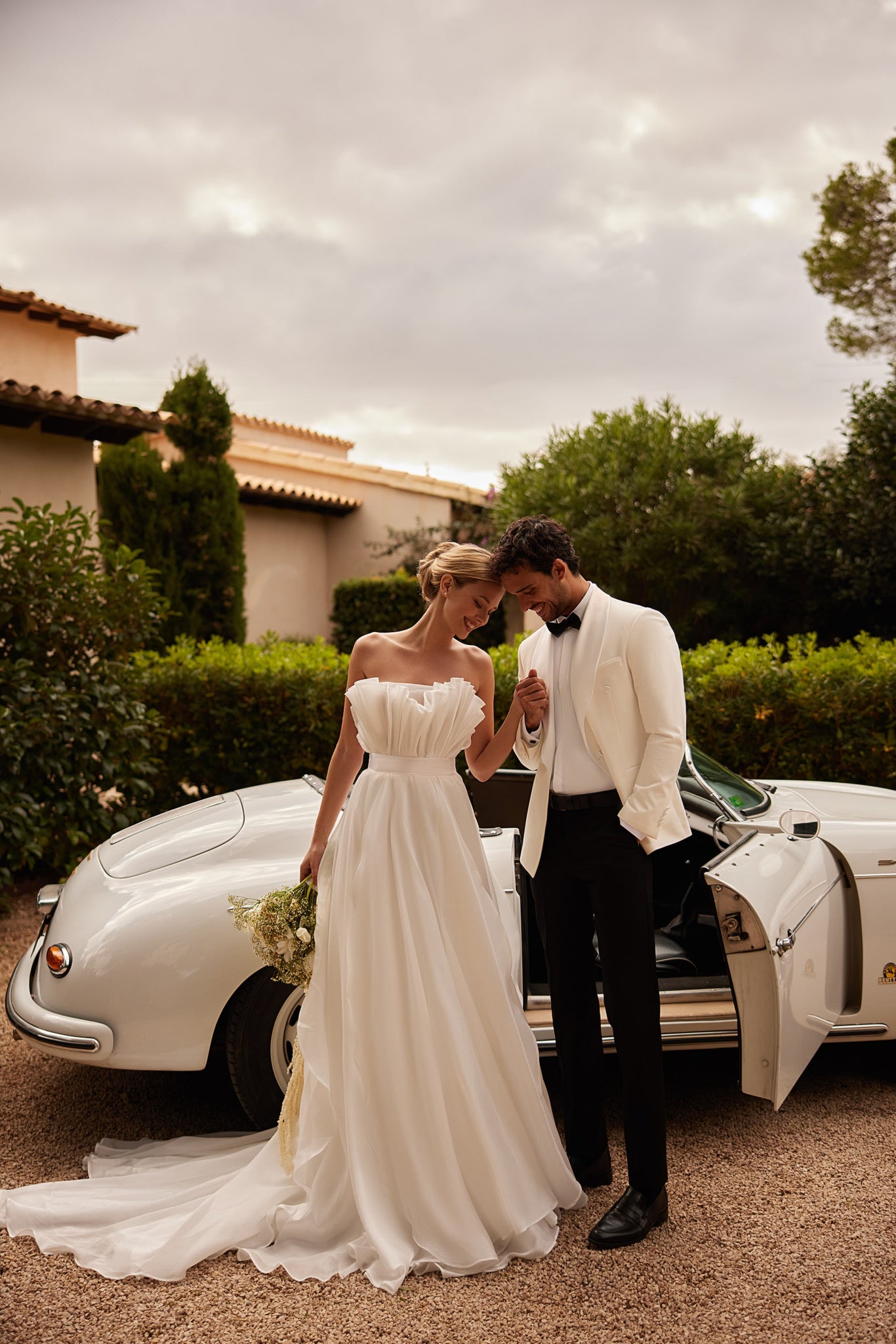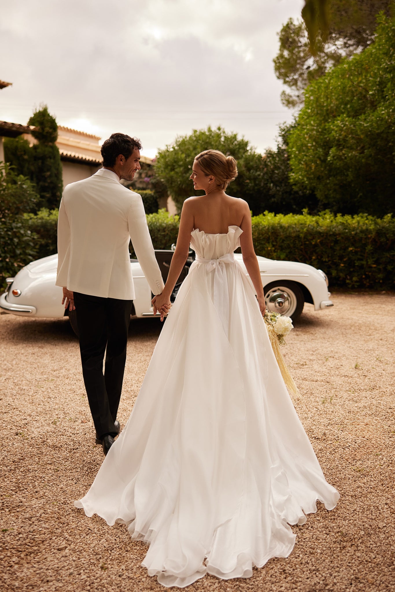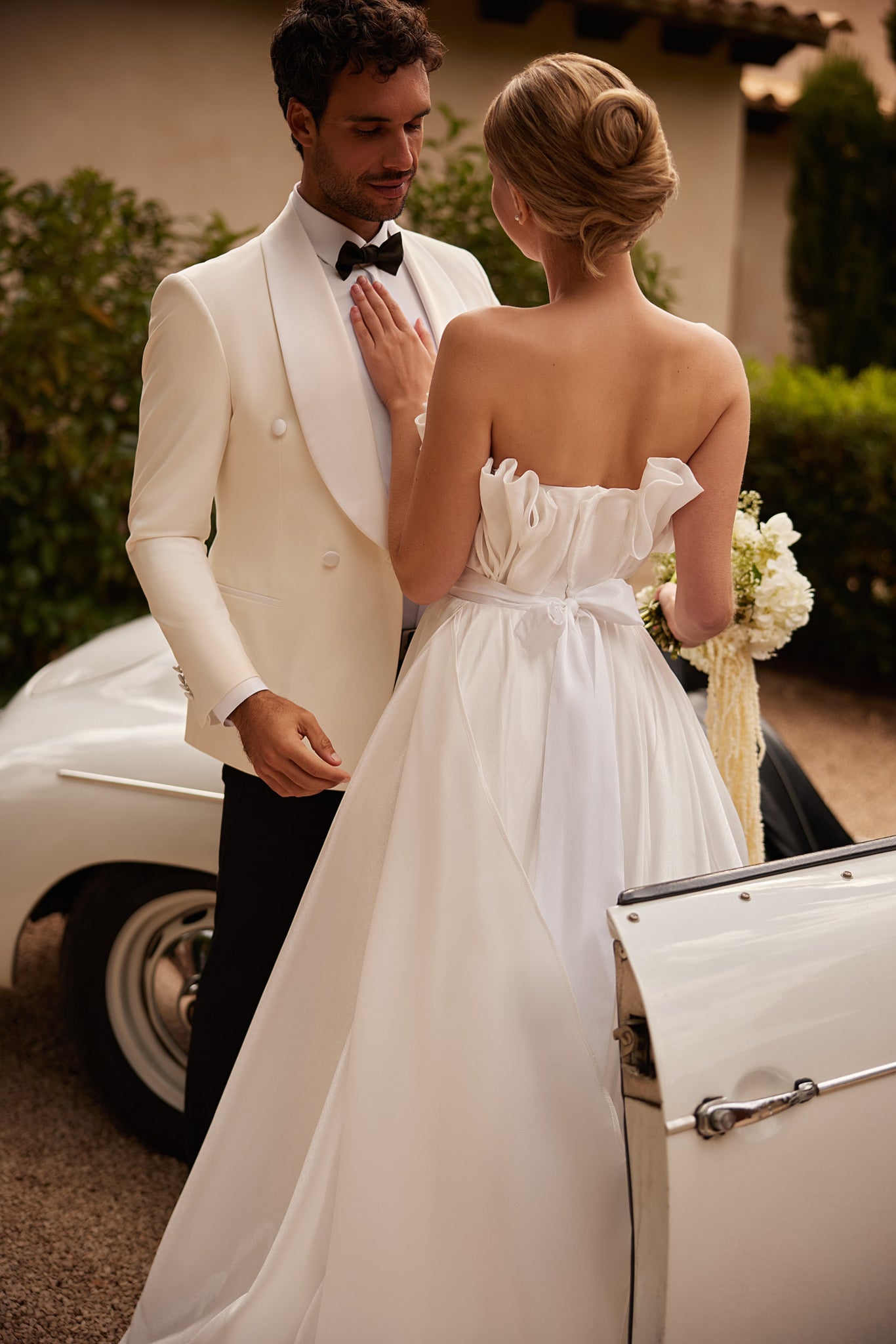 This strapless A-line gown is effortlessly chic and features a statement ruffled neckline and a flowing skirt. The soft pleats and structured bodice offer modern elegance, while the waist tie detail adds a romantic finish‚¬”perfect for a bride with timeless taste and a fashion-forward spirit.