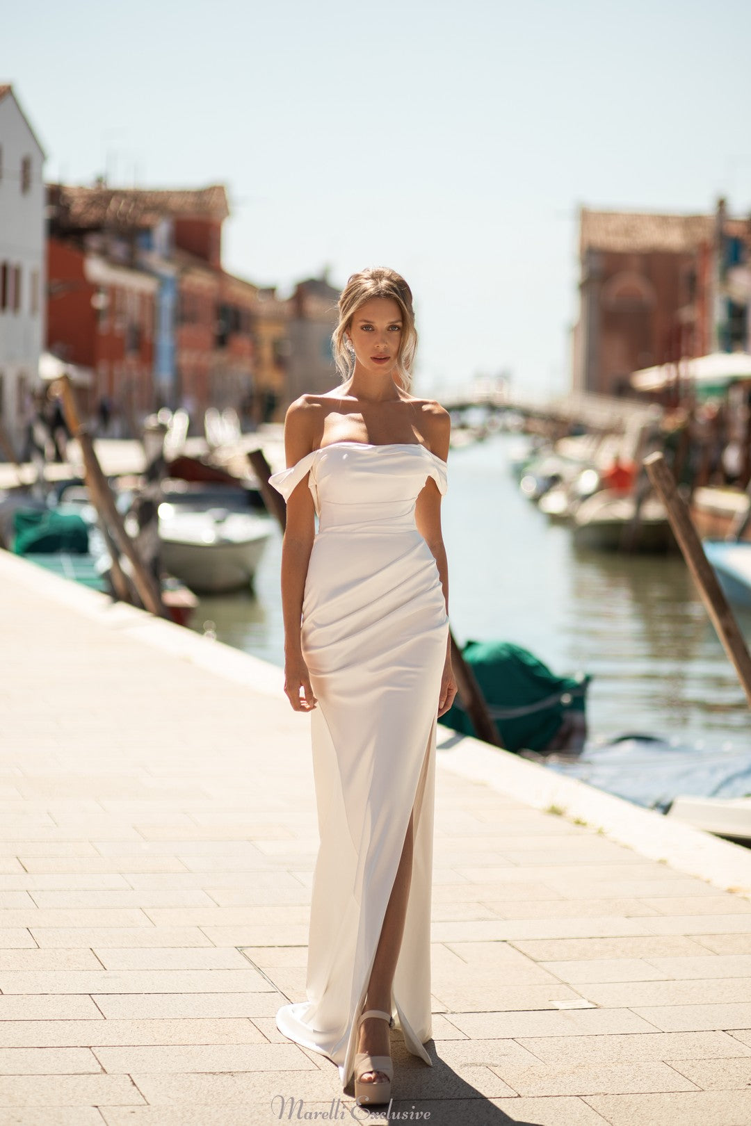 This elegant ruched satin wedding dress flaunts off-the-shoulder sleeves and a thigh slit, accentuating feminine curves with a touch of sophistication. The column silhouette exudes simplicity and grace, creating a timeless and stylish bridal look.