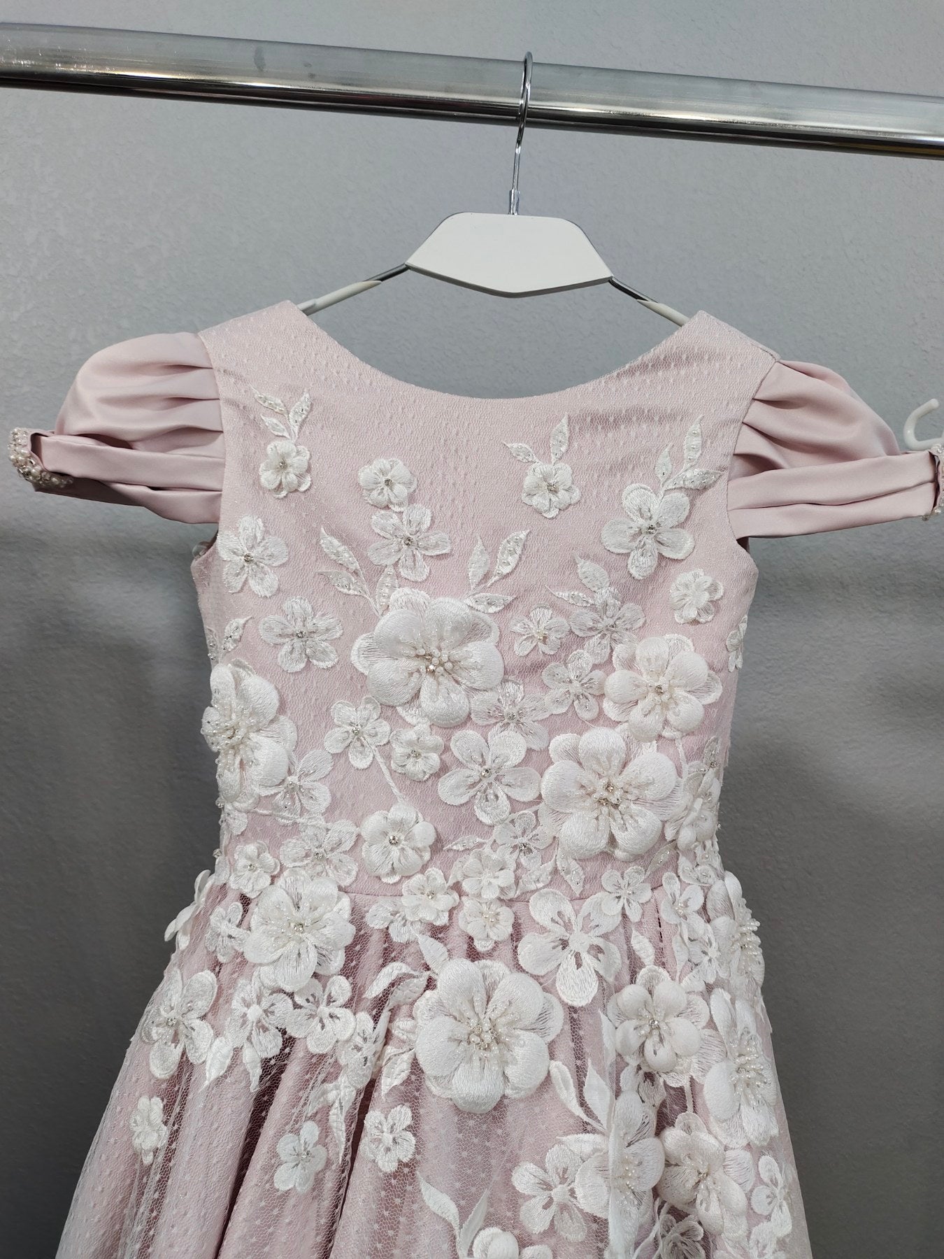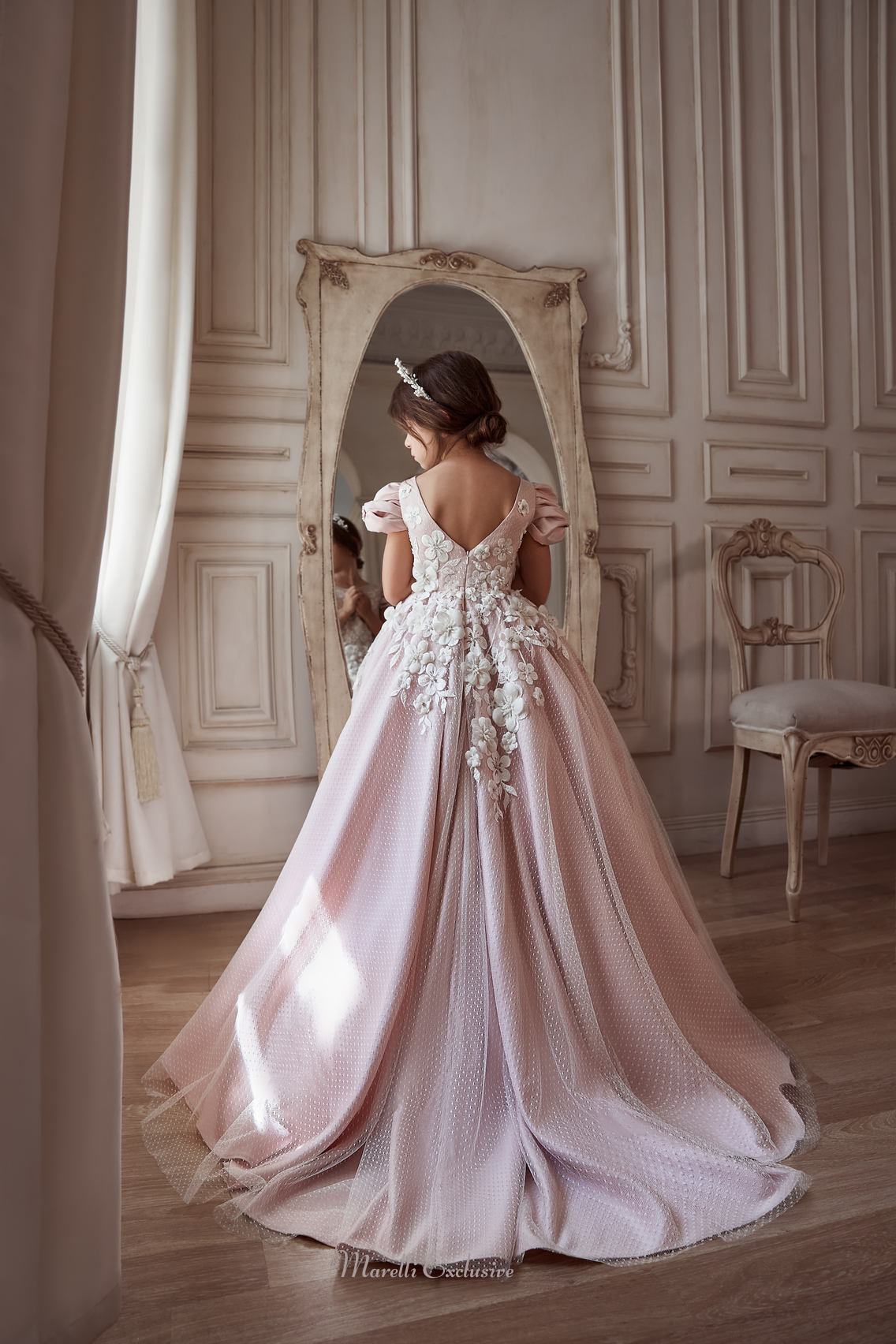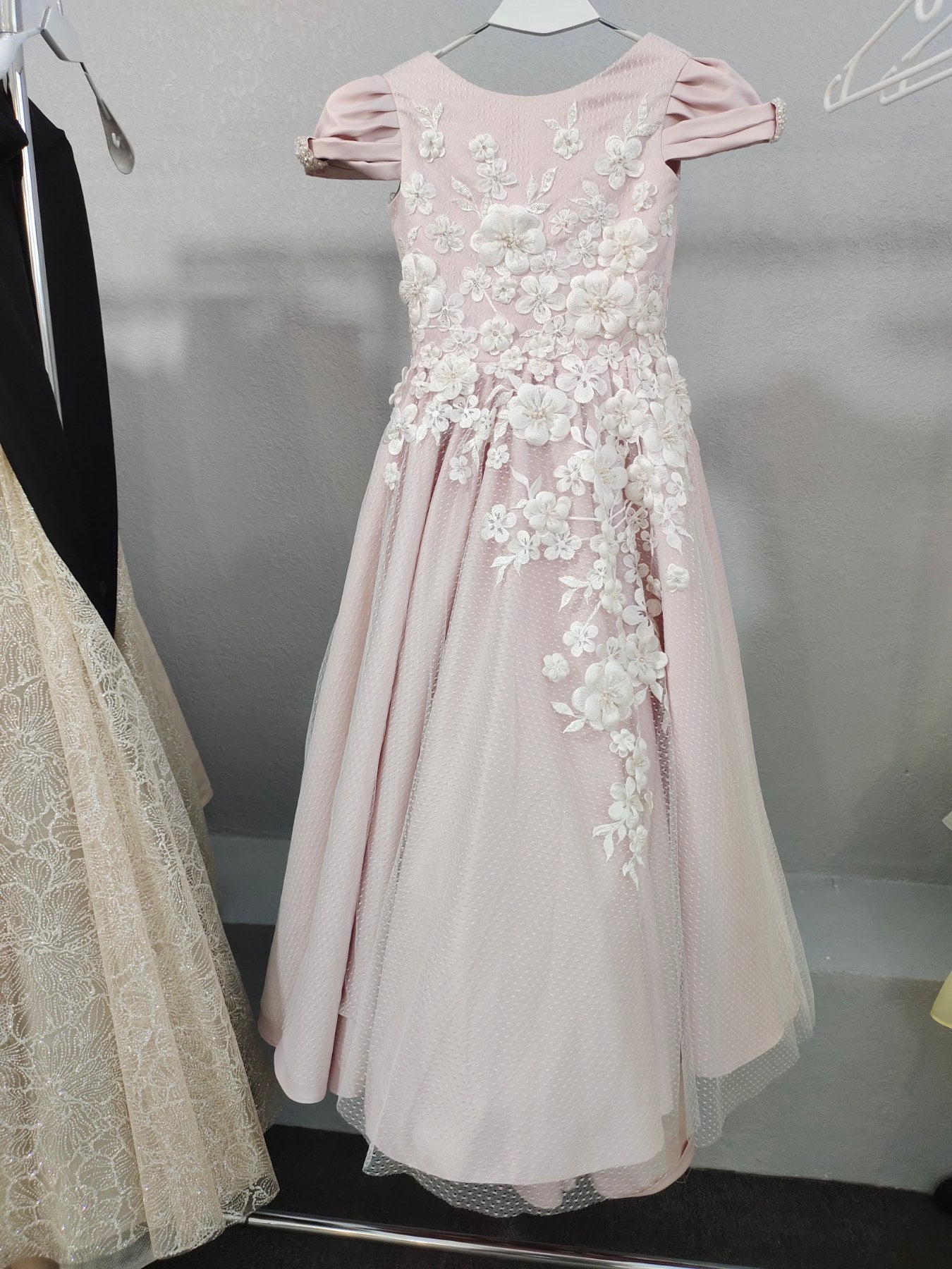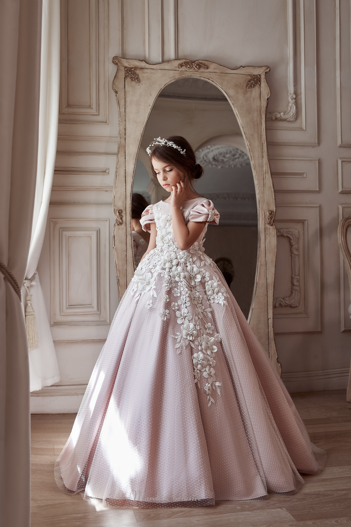 Do you want your daughter to feel like a princess? Then, you might buy this gown fabricated using 3D Floral appliques, short puffy sleeves, a multilayered ballgown skirt, and a V back with zipper closure.
