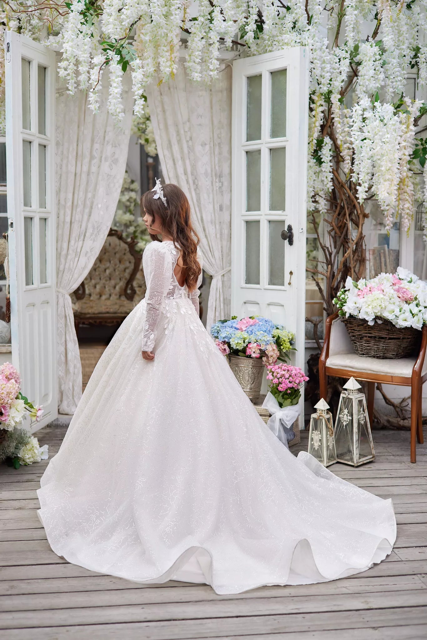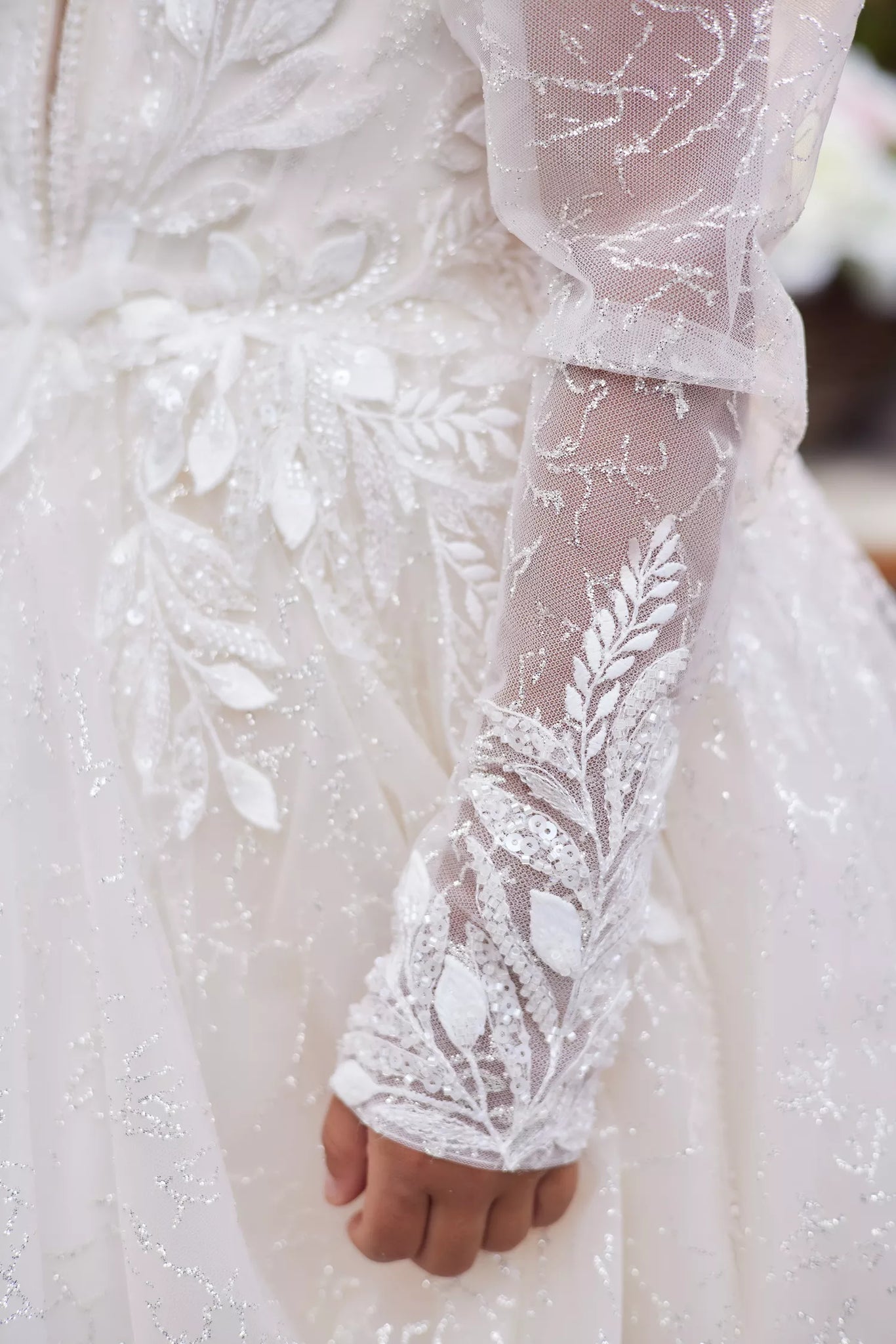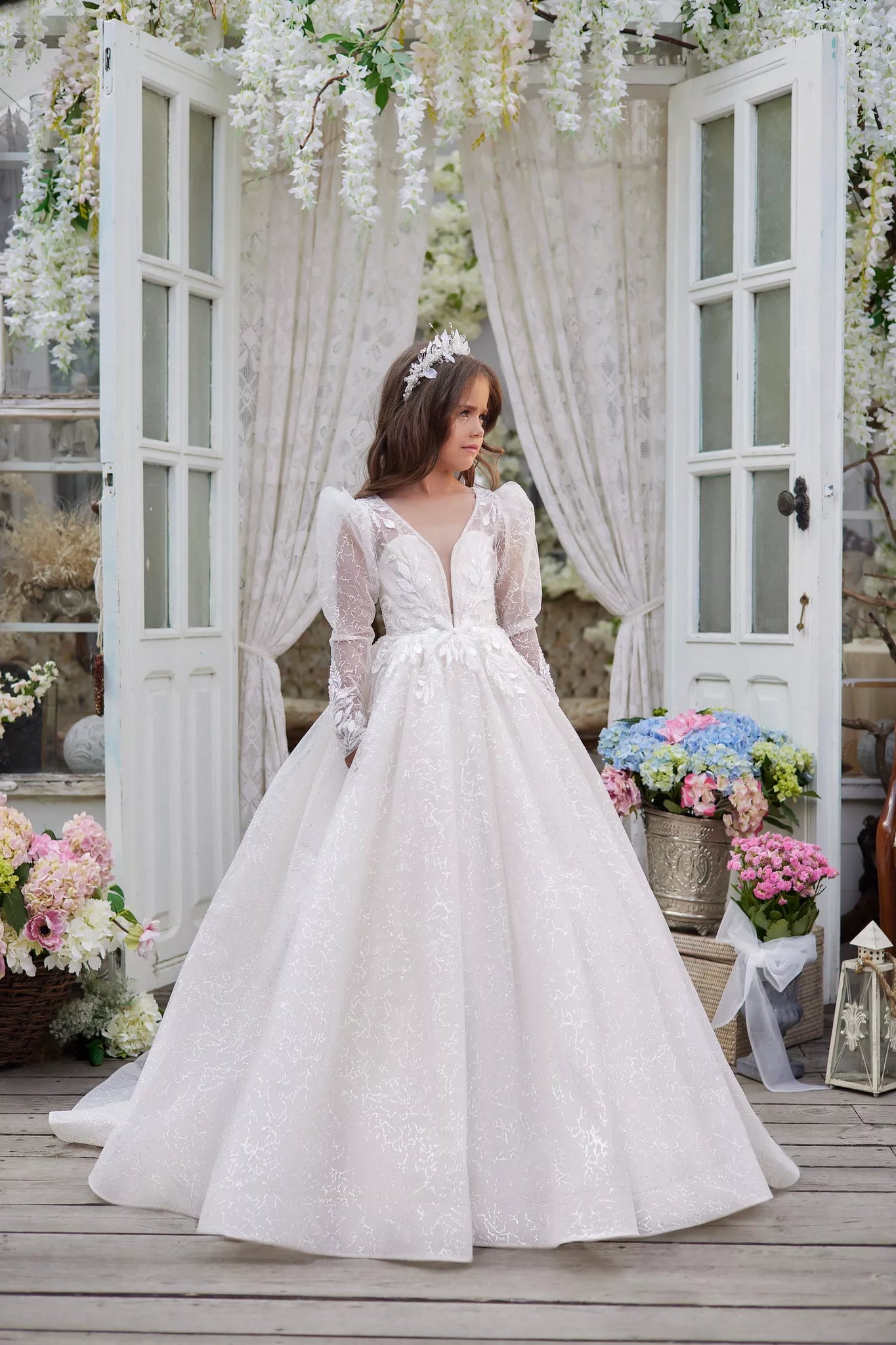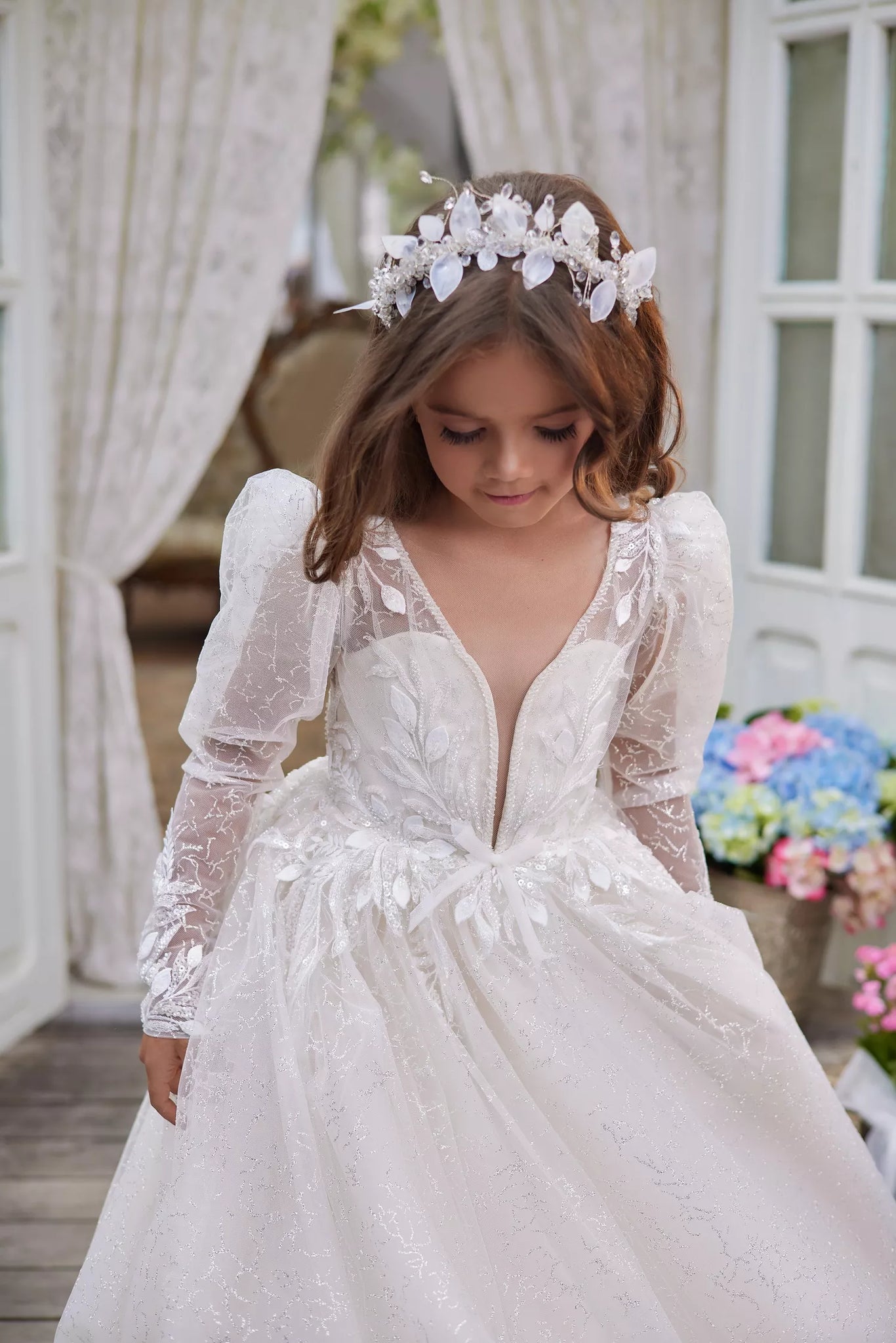 Behold this graceful, long-sleeved girl's dress, a true epitome of elegance, where puffed shoulders adorn floral lace sleeves. The enchanting lace pattern continues its journey, seamlessly extending to embellish the bodice. The dress comes alive with a radiant display of glimmering lime patterns that unite across its predominantly sheer layers, casting a celestial, starry-like enchantment. As this majestic long dress makes its way, it leaves a trail of pure ivory waves that flow gracefully to the hem, evoking a sense of timeless charm and beauty.