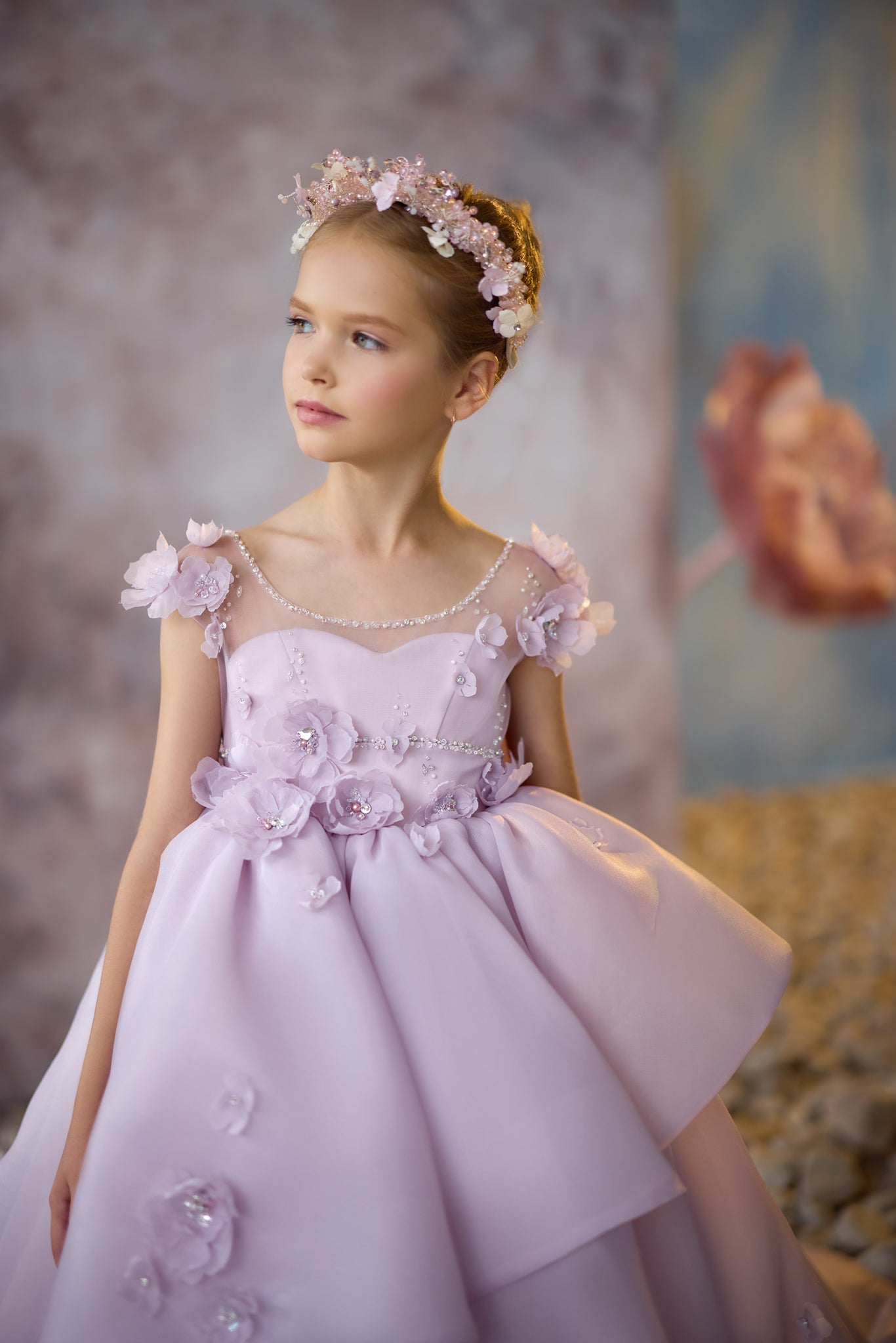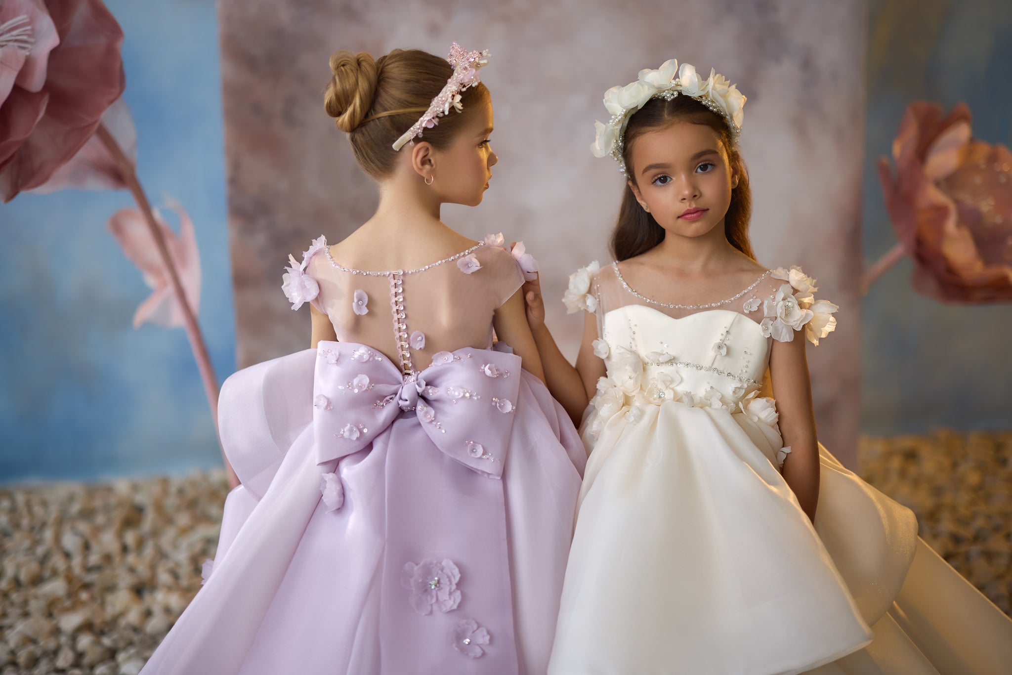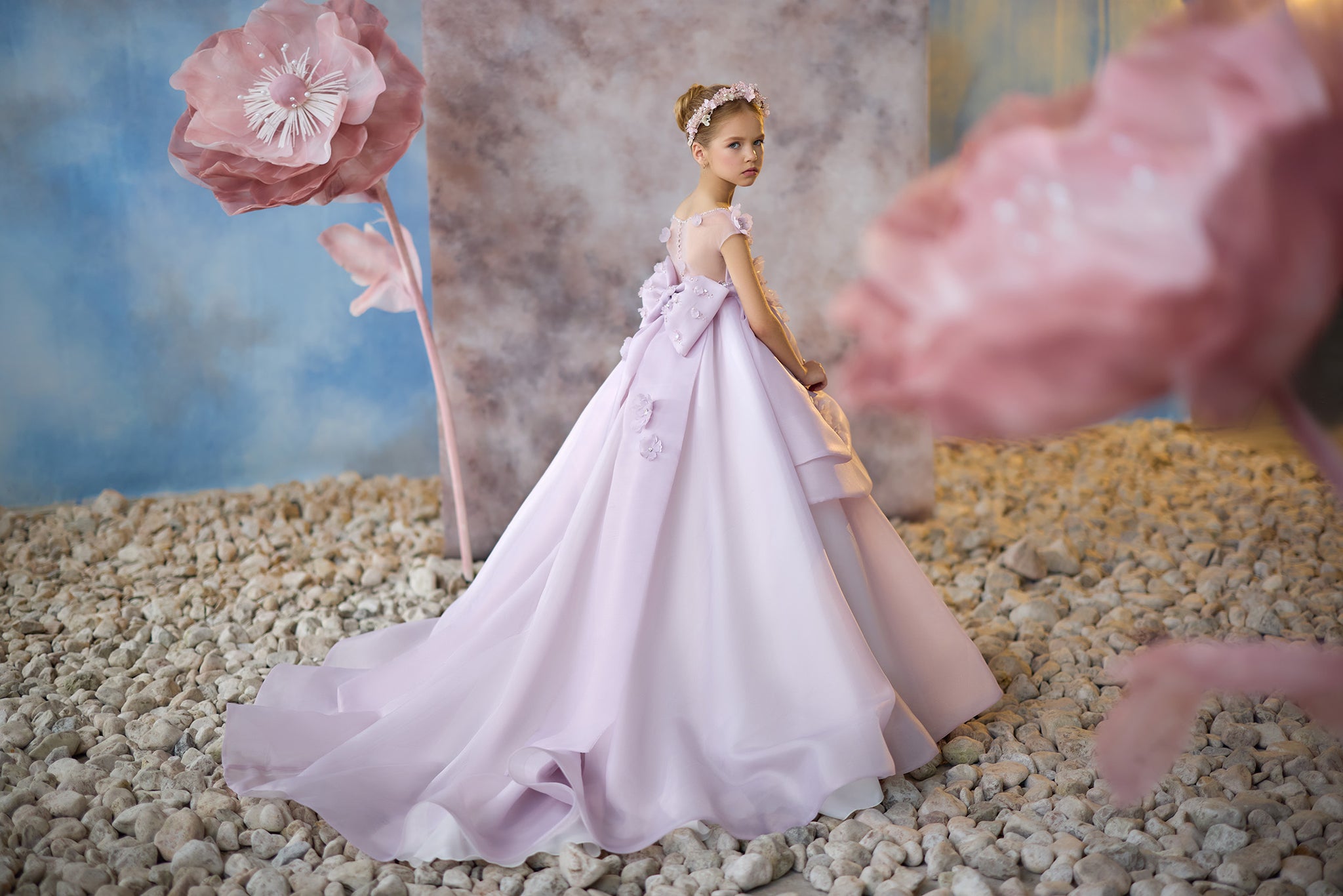 This enchanting kids' gown boasts a layered organza skirt and a bodice embellished with delicate floral appliqués and pearl accents. A large bow on the back adds a whimsical touch to this elegant dress, perfect for special occasions.