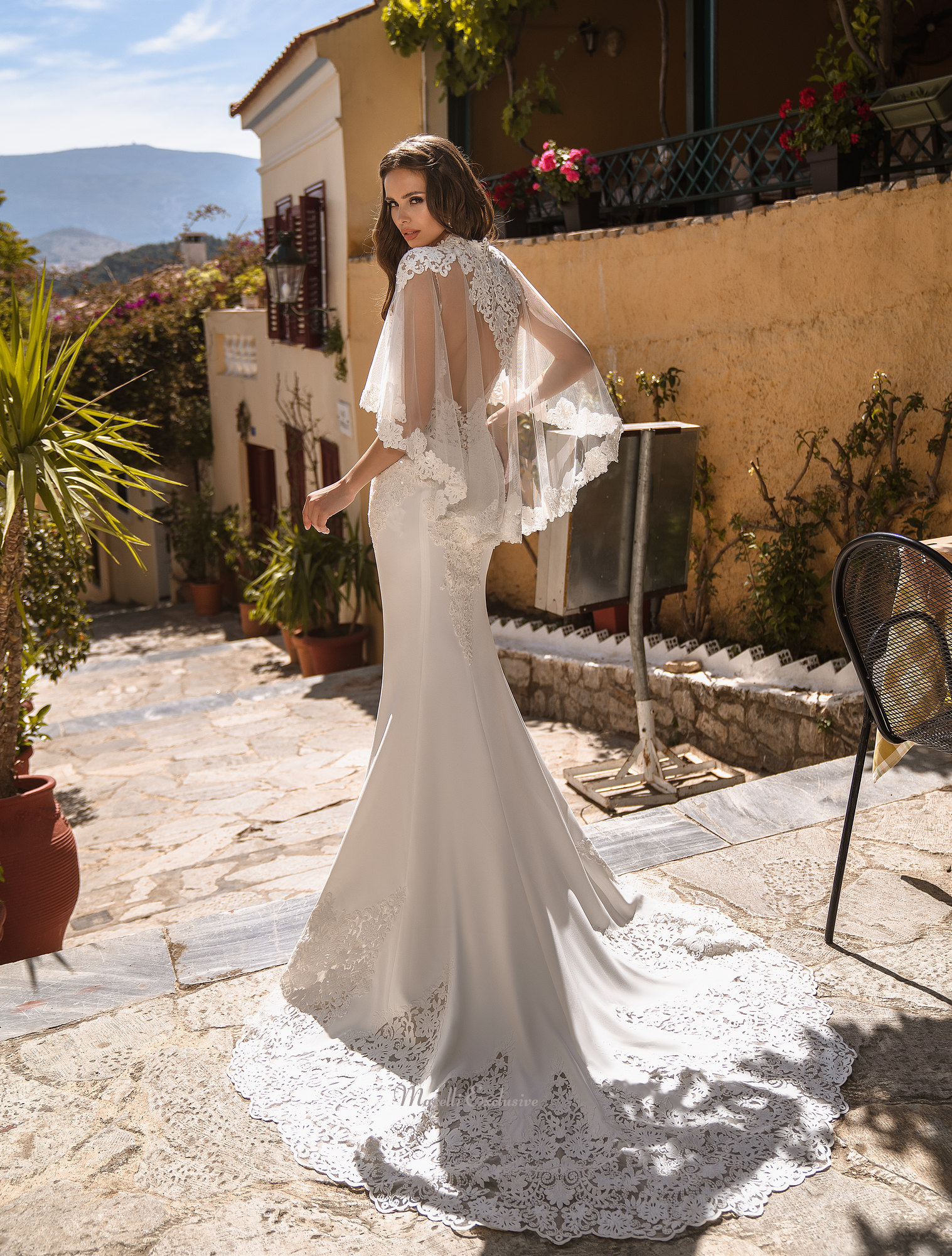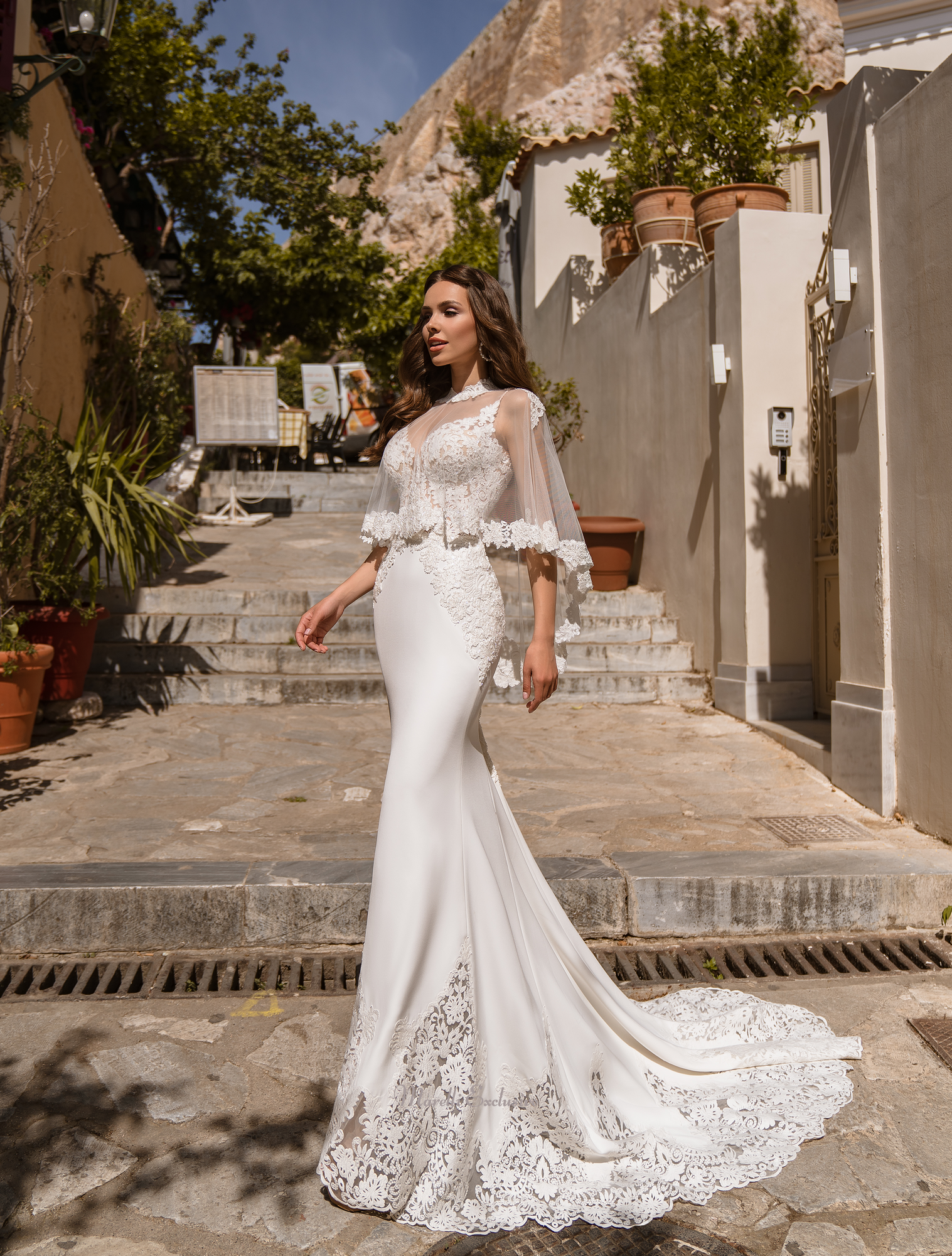 Wedding set, consisting of the dress on thin straps and a cape. Soft skirt smoothly fits the figure, the bottom of the skirt. Figured cut of the bottom of the skirt is decorated with guipure. Light cape with figured collar creates new, more conservative look.