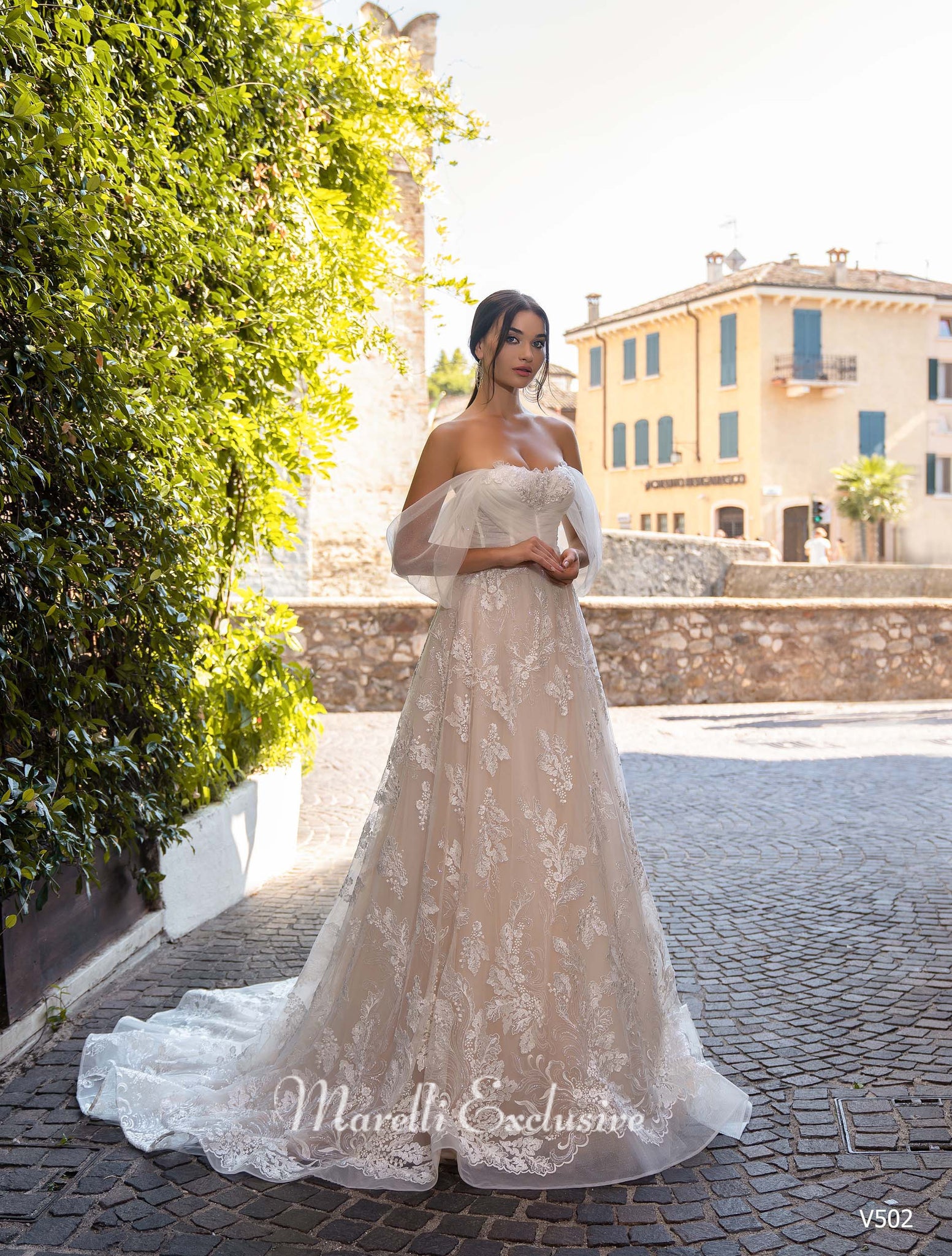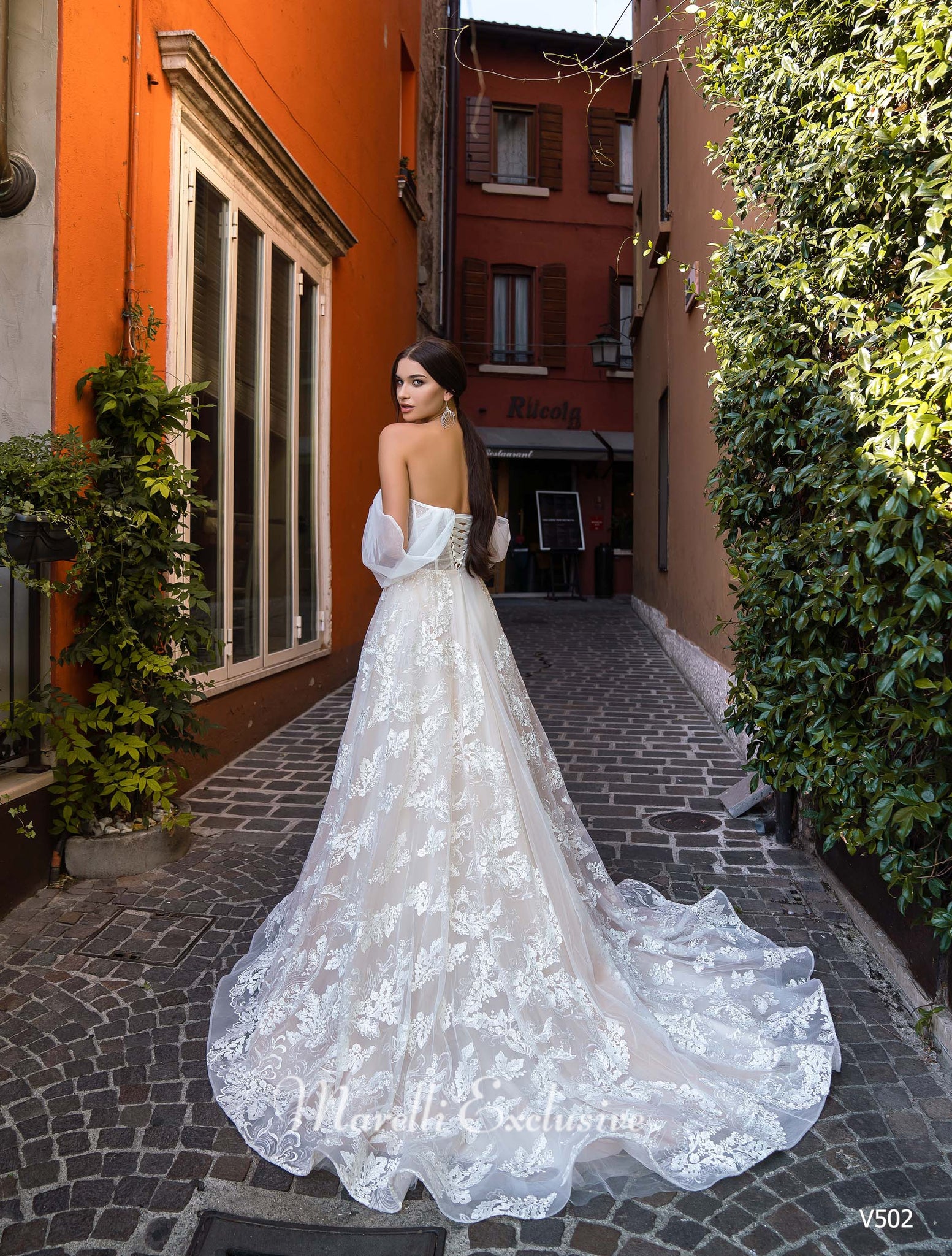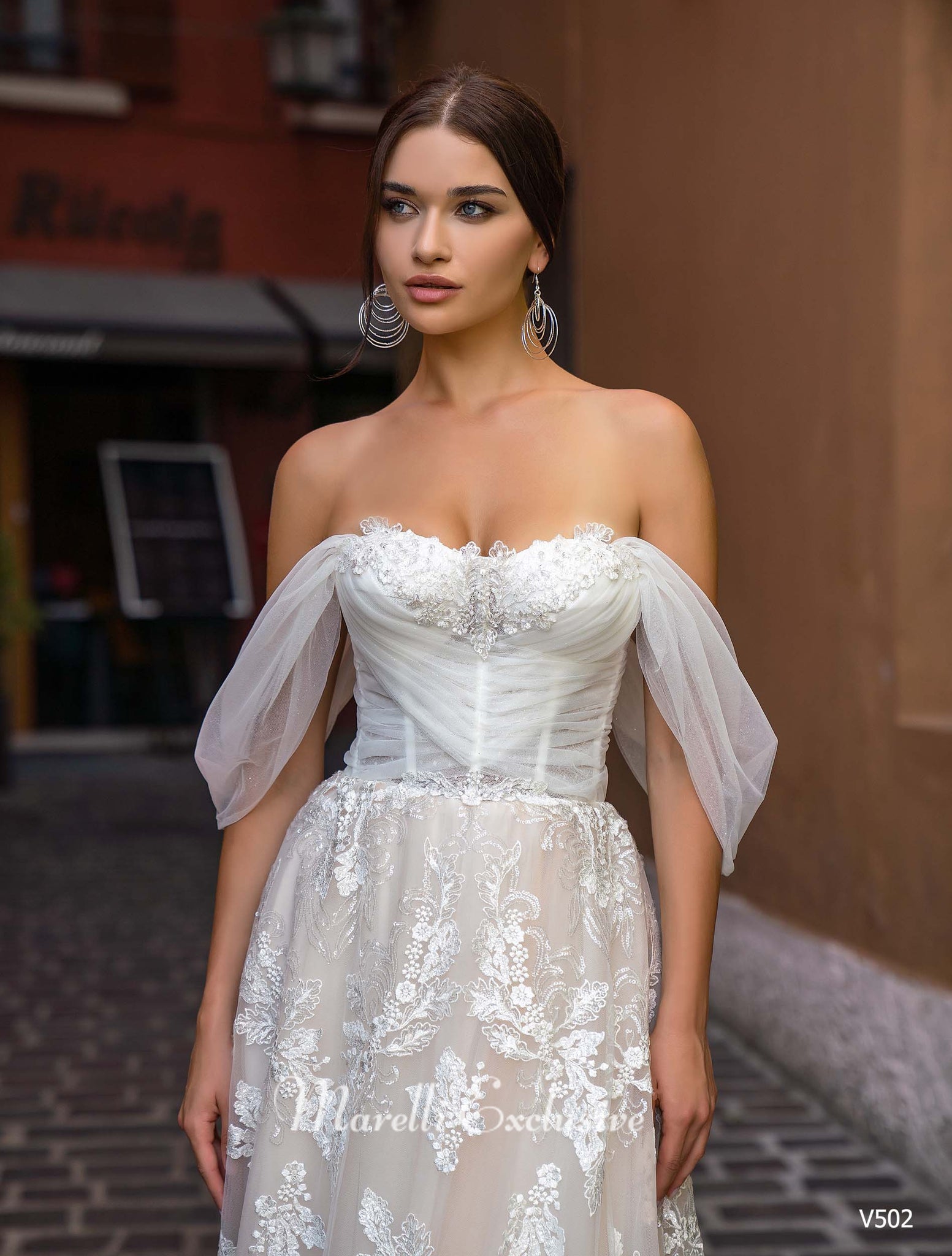 Astonishing A-line fit Wedding Dress. Featuring an off the shoulder look, a sexy sweetheart neckline, beautiful flowing shimmering skirt, and train. The back is gracefully adorned and lace up. The corset is jeweled and laced. The skirt is exquisitely embroidered with beautiful flowing floral patterns. .