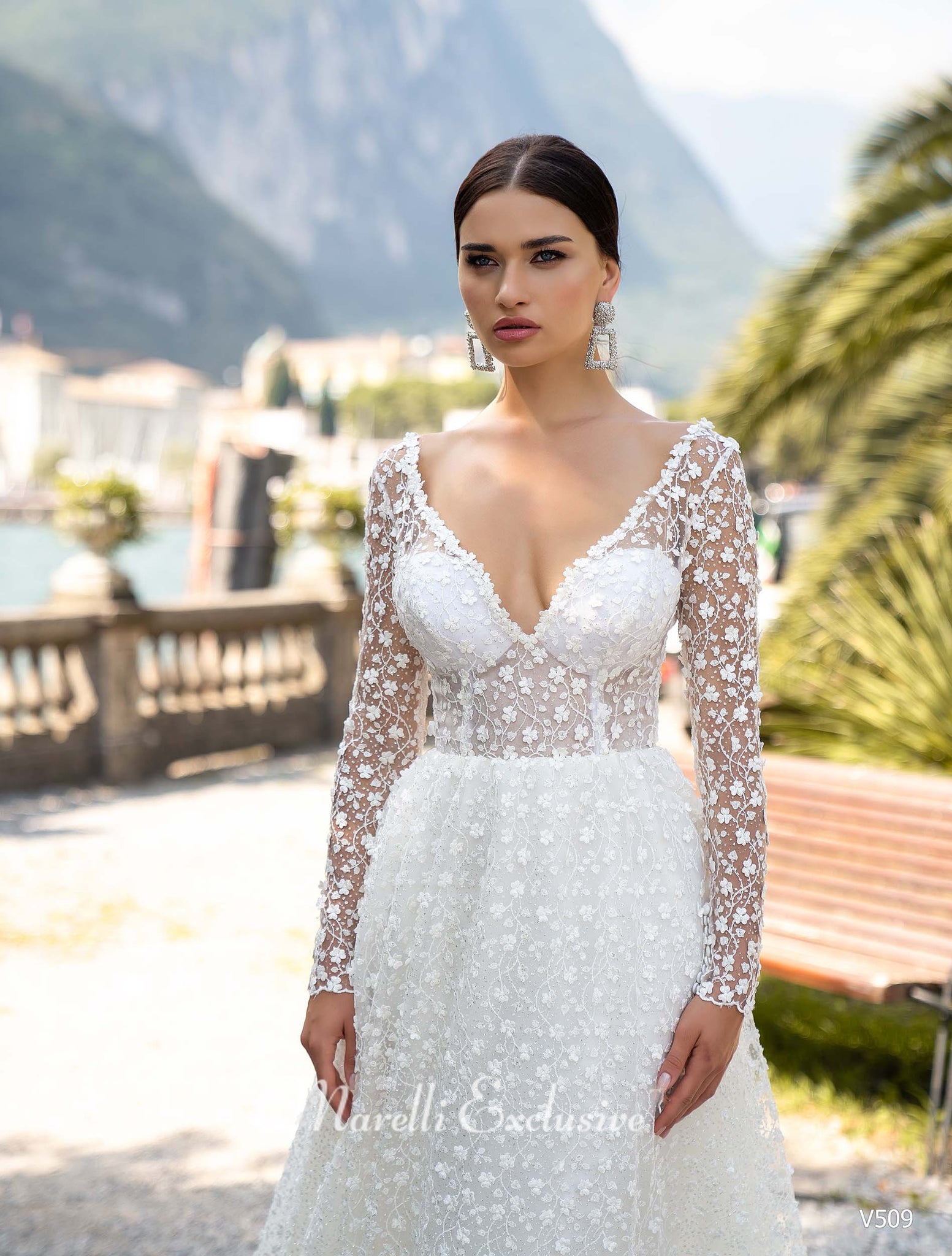 Charming A-line fit Wedding Dress. Featuring decorated long sleeves, a sexy V neckline, a beautiful flowing skirt, and a train. The back is gracefully adorned and open. The corset and skirt are exquisitely jeweled with beautiful flowing floral patterns. Appliqués are delicately sewn throughout the gown.