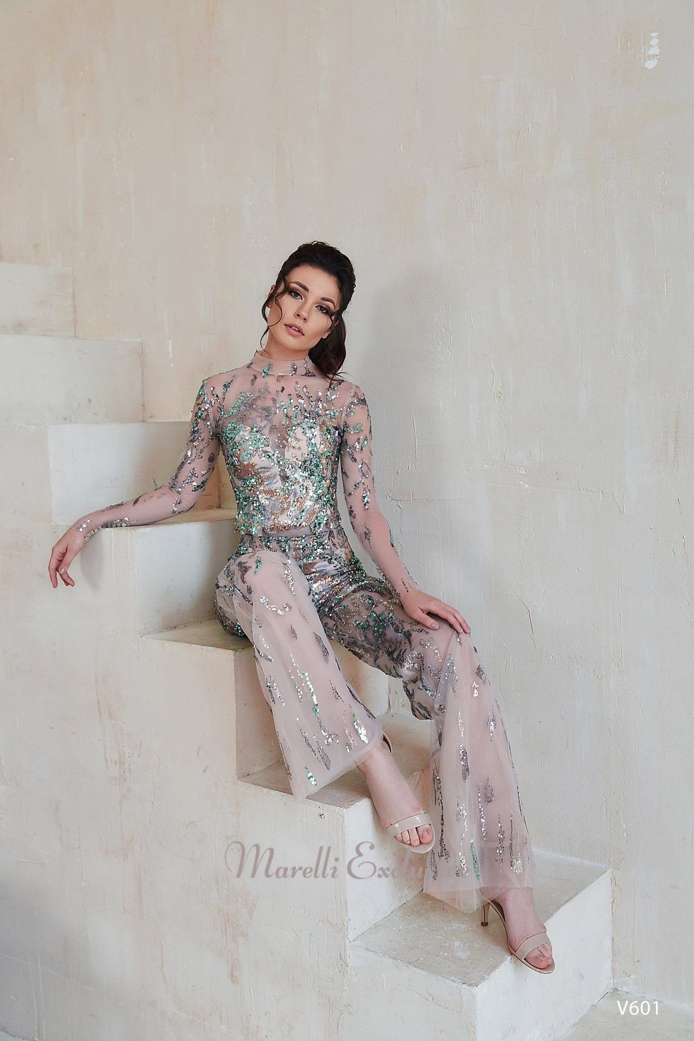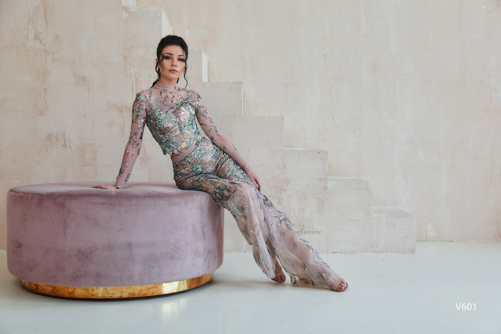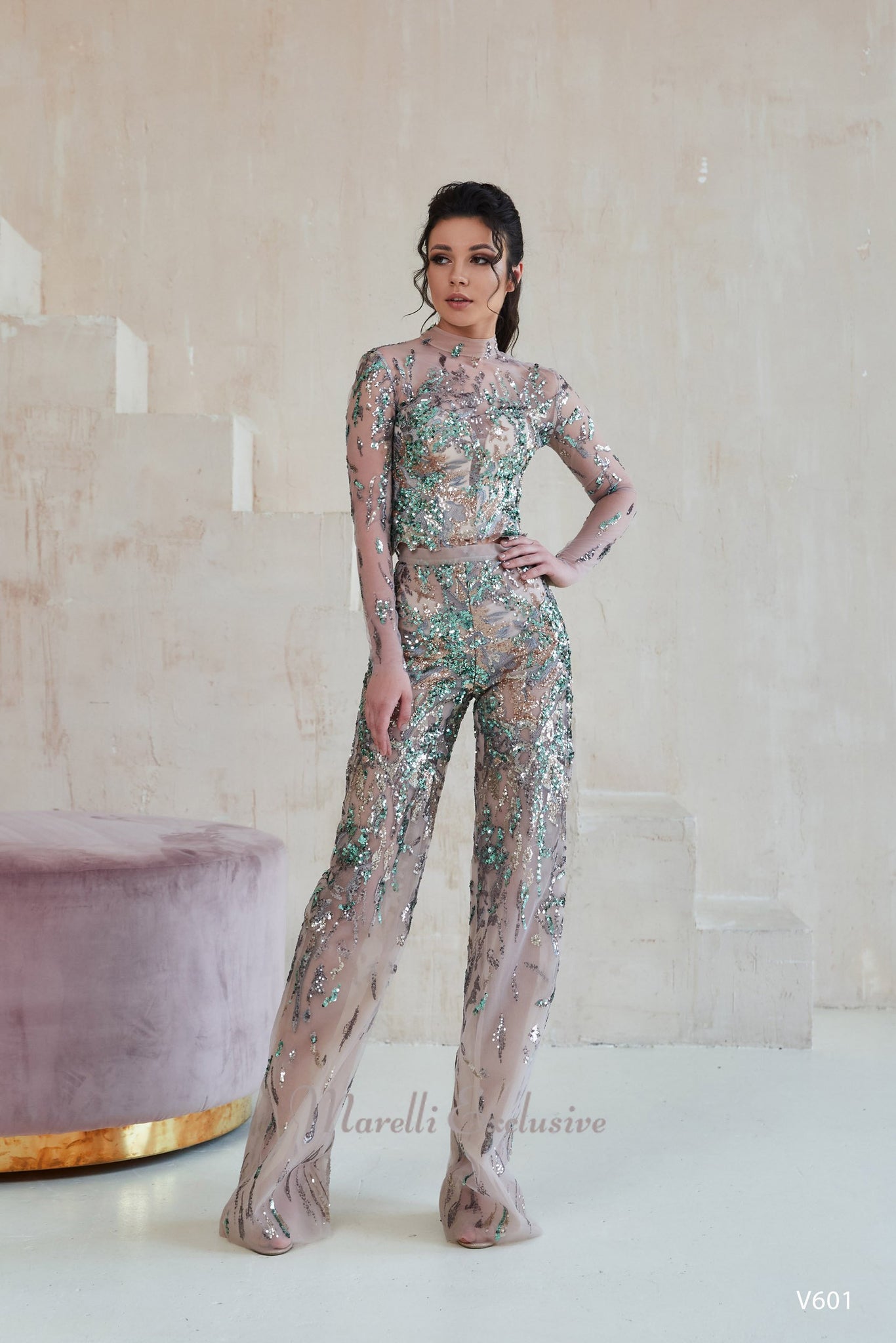 This sophisticated and sparkling pantsuit is appropriate for a ball or any formal occasion. You will turn heads in this stunning two-piece outfit. Pair this gorgeous long-sleeve, high-neck ensemble with sexy high-heels and your favorite earrings.