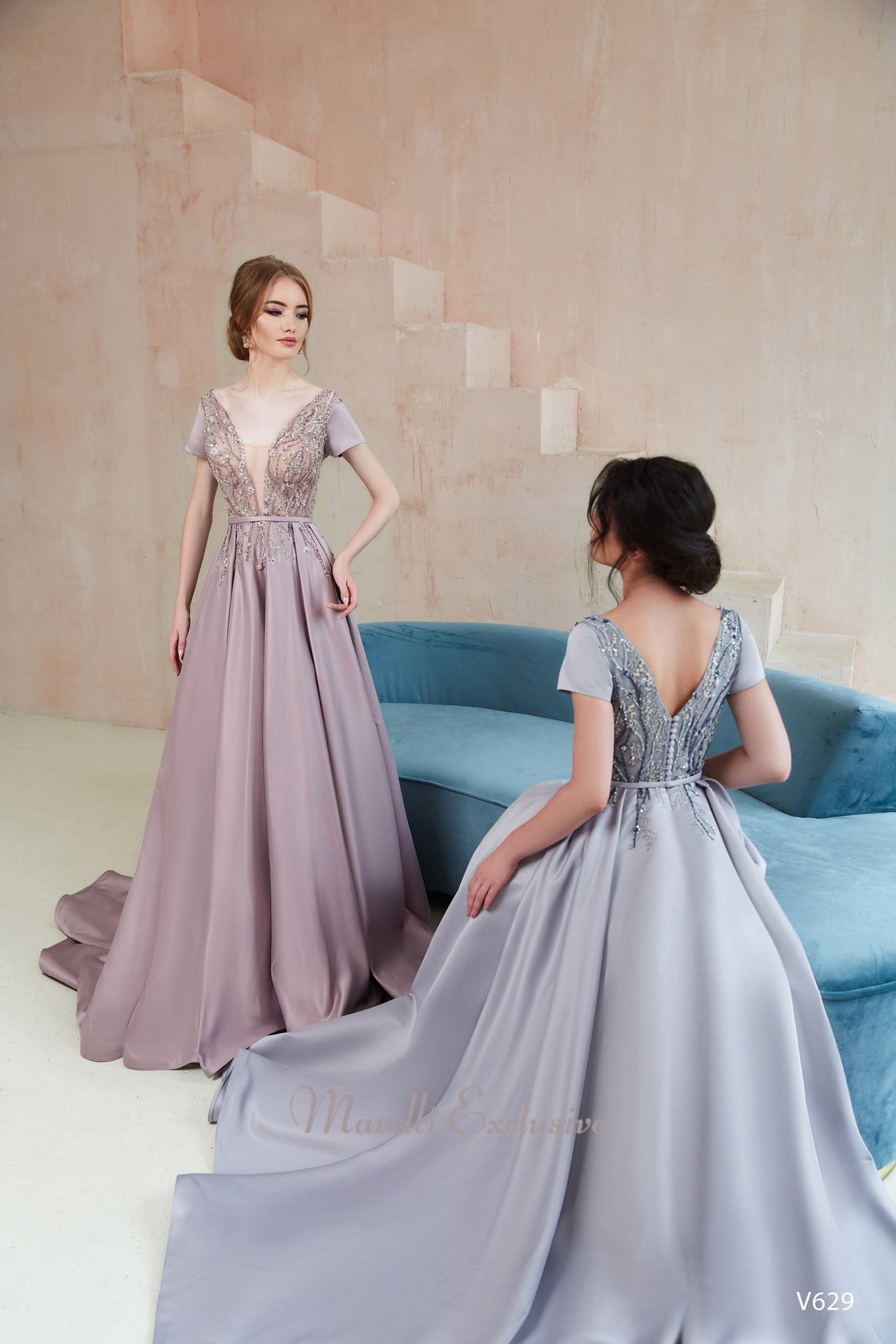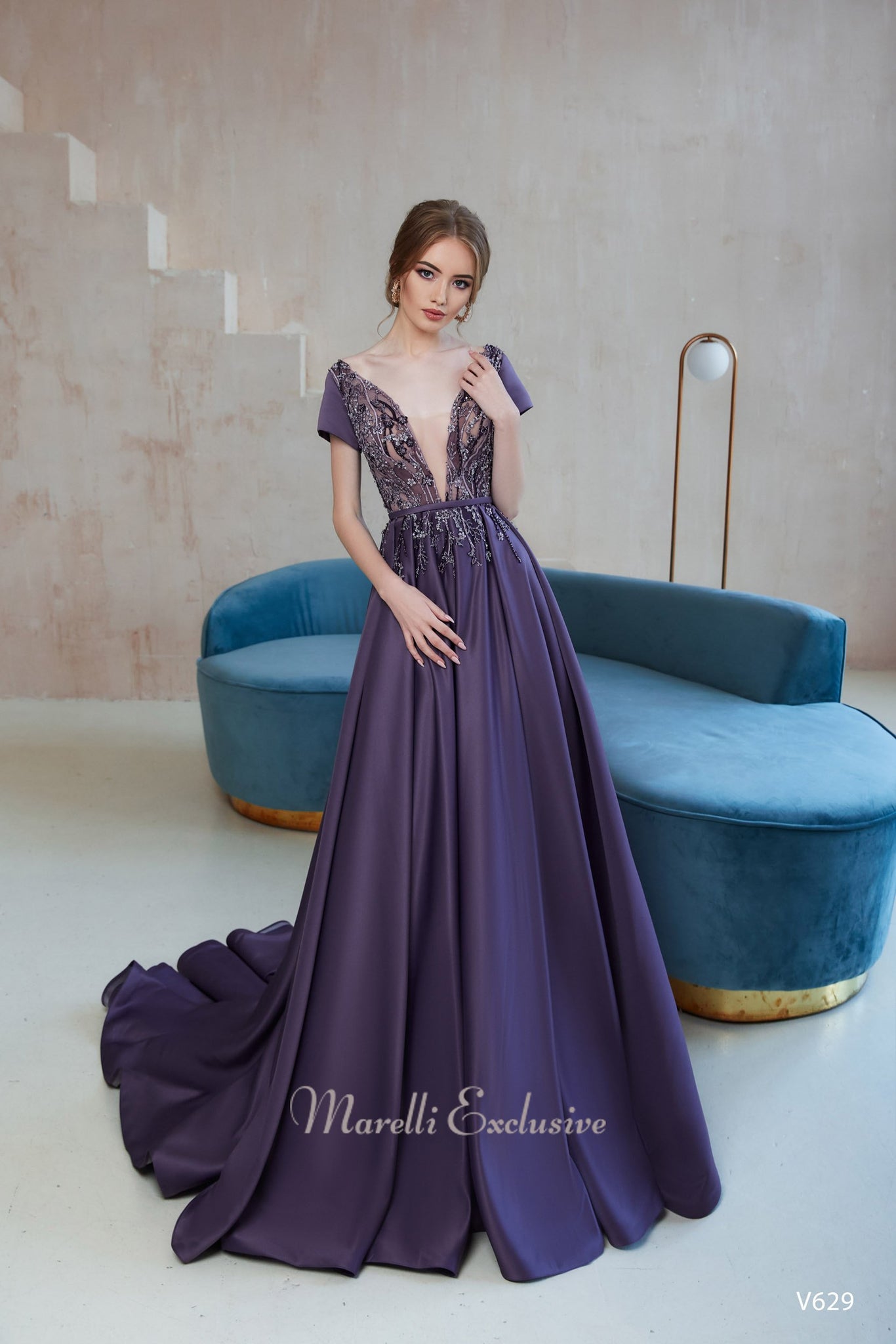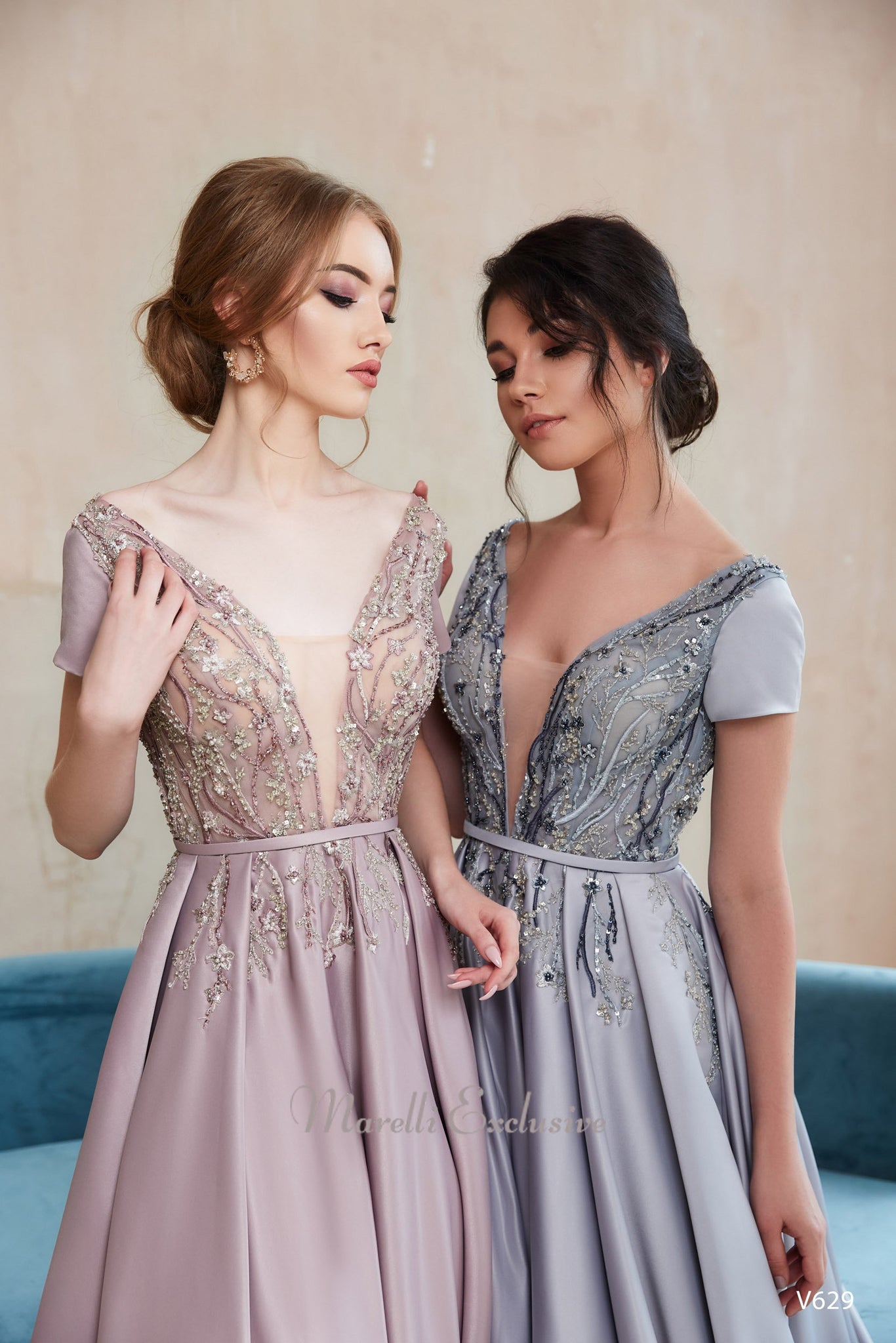 This exquisite dress showcases a deep low V-neck with an additional modesty window, adding an elegant touch. The off-the-shoulder design exudes charm, while the intricately detailed bodice and full-length skirt create a captivating and alluring look, making it an ideal choice for any special occasion