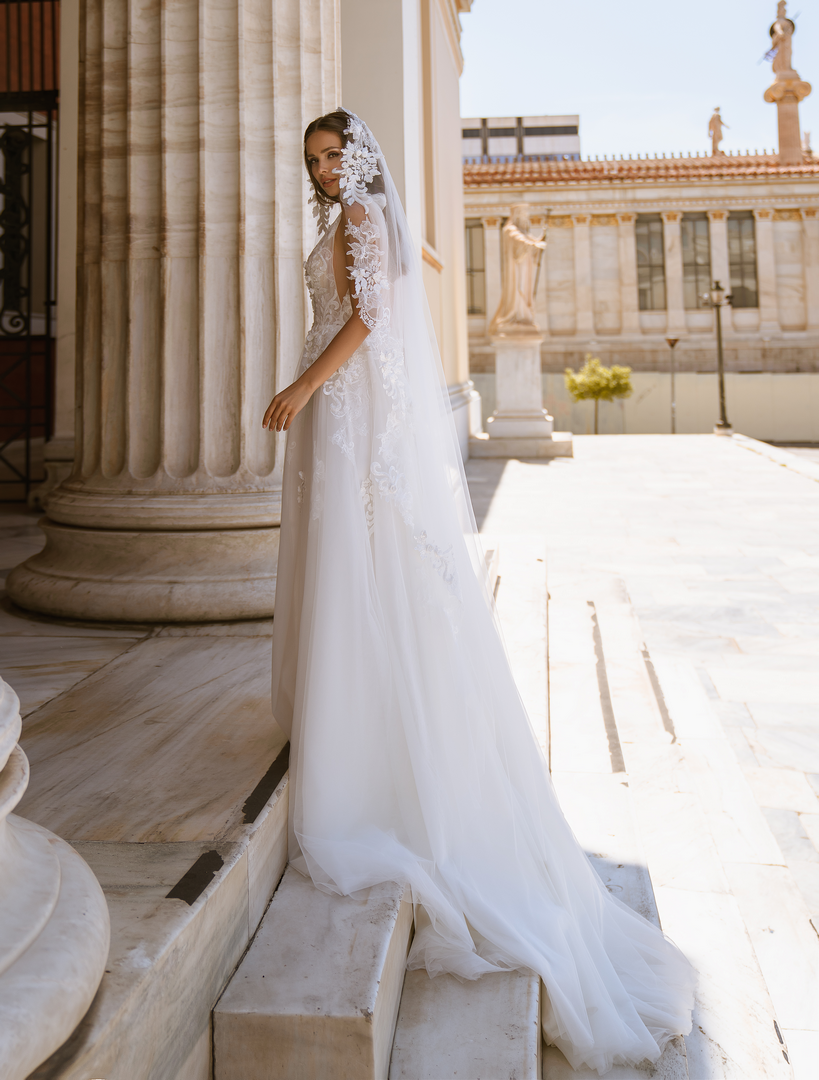 Mantilla veil made of delicate mesh 2x1,5 m. Decorated with elements of 3-D guipure with cord, embroidered with beads, sequins, pearls and flowers. It has bridal loops at the top.