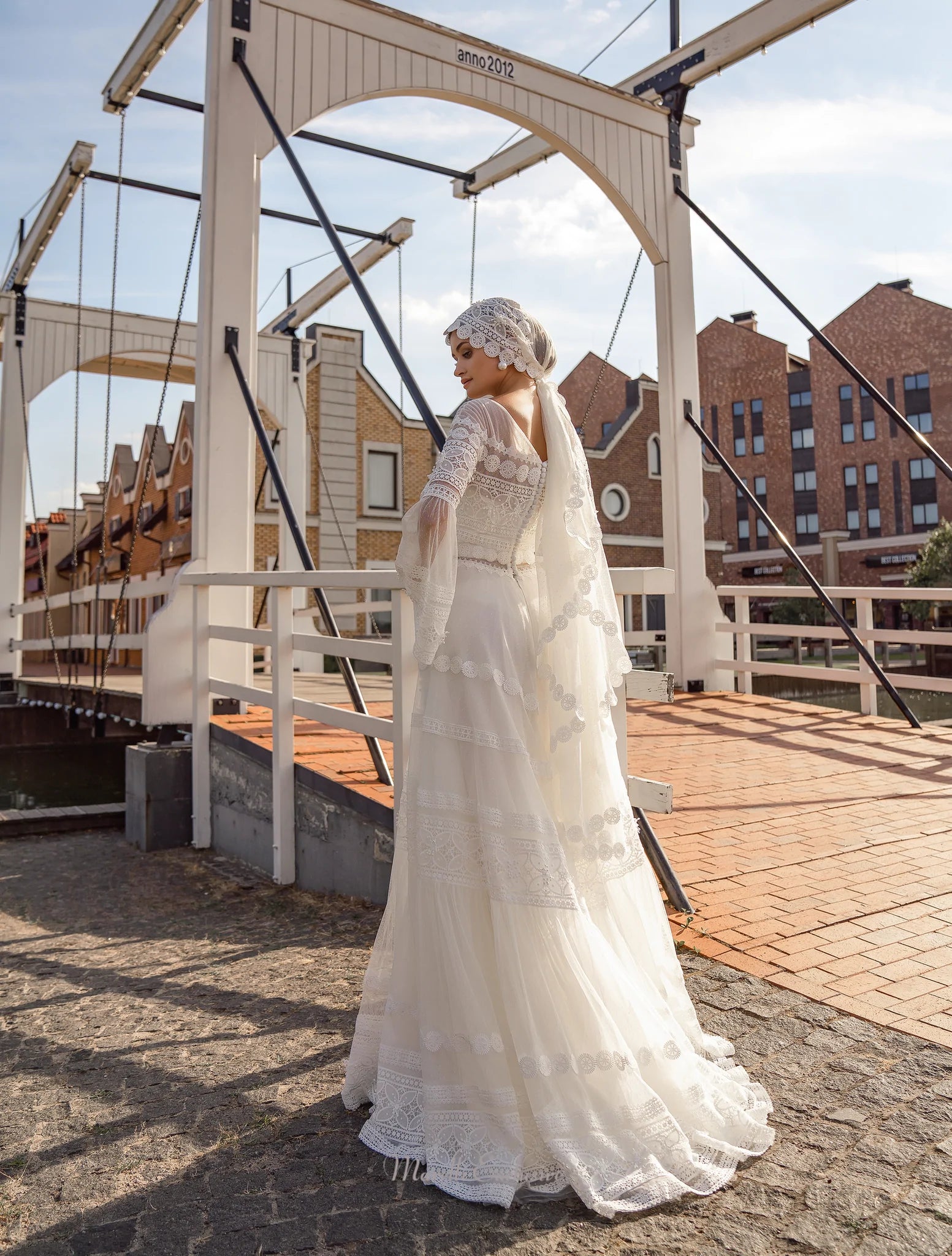 Boho style veil made of delicate mesh in dots 1,5x1,5m. Decorated with two kinds of braid- macramé. Tied with satin ribbon.