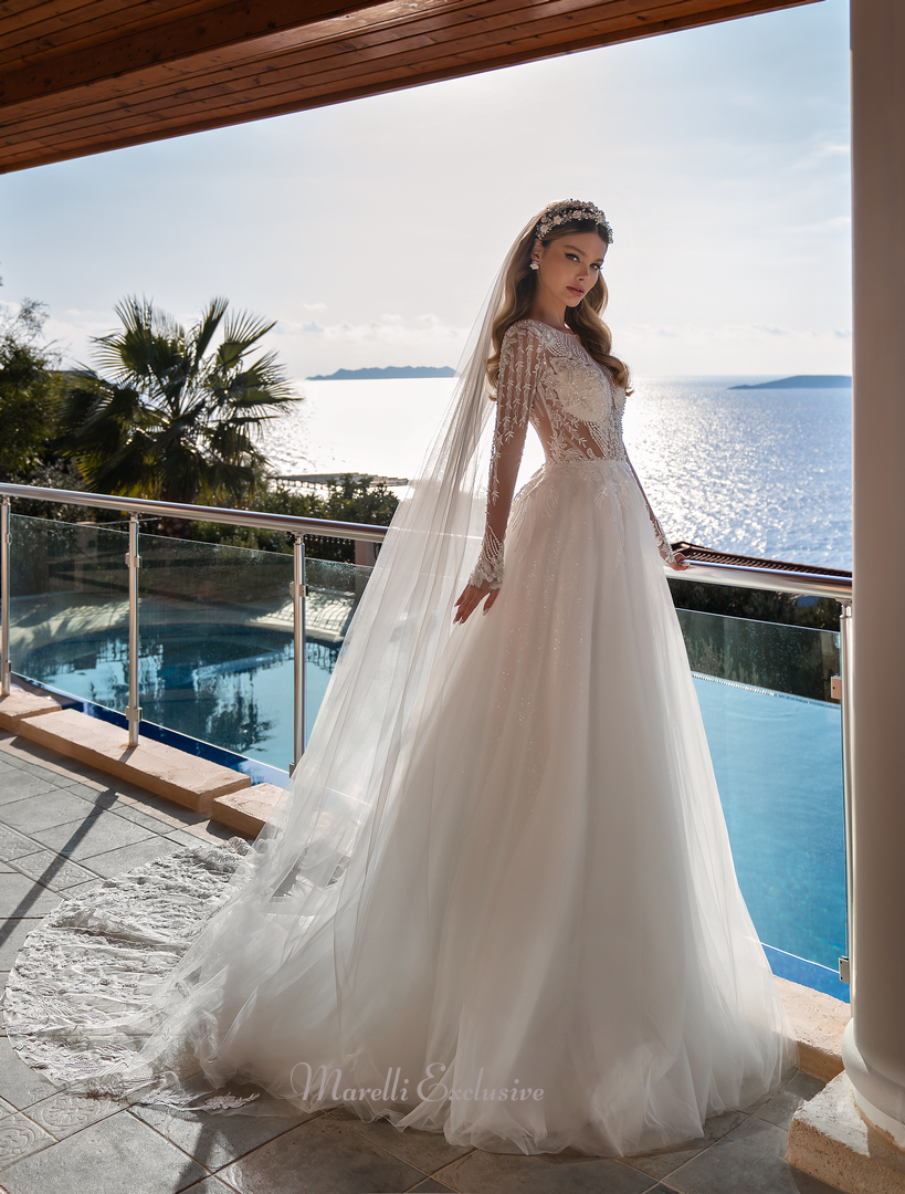 A romantic veil crafted from fine tulle, measuring 2.6 x 3.0 meters. This “bunch” style veil is beautifully finished with ornate guipure lace appliqués embroidered with sequins along the bottom edge, adding a soft shimmer. Loops are sewn at the top for easy and secure attachment.